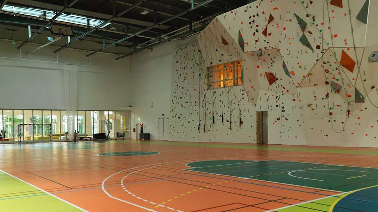 Installations en intérieur : murs d’escalade, gymnase polyvalent, salle de musculation, dojo, salle polyvalente (danse, escrime, escalade)